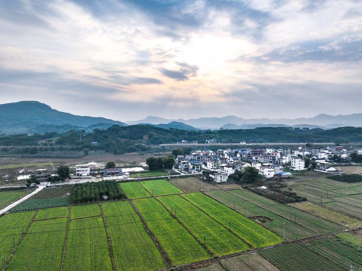 12月31日,一列动车从鹿寨县中渡镇马安村高椅屯通过土地归纳整治后建成的高标准农田和村庄驶过喻湘泉 摄