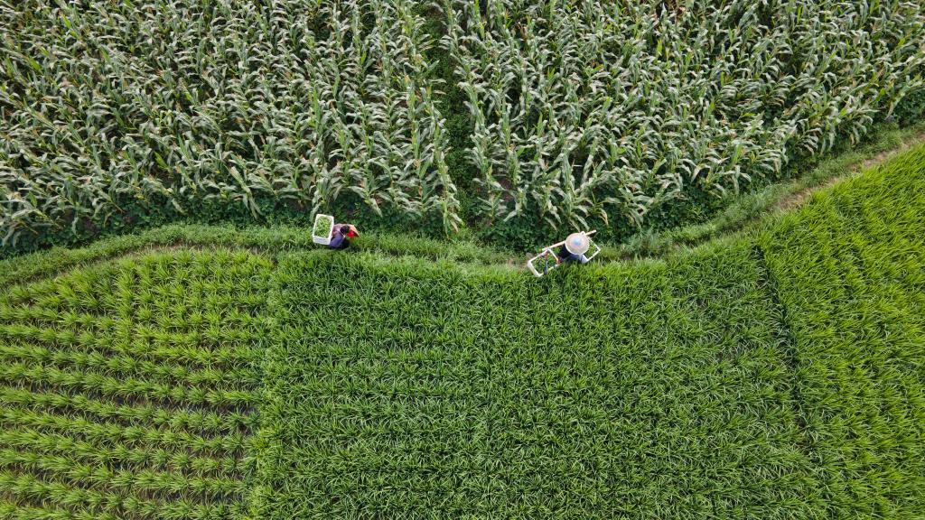 2022年7月7日,在重庆市秀山土家族苗族自治县溶溪镇柳水村,村民在搬运辣椒(无人机照片)。新华社发(胡程摄)