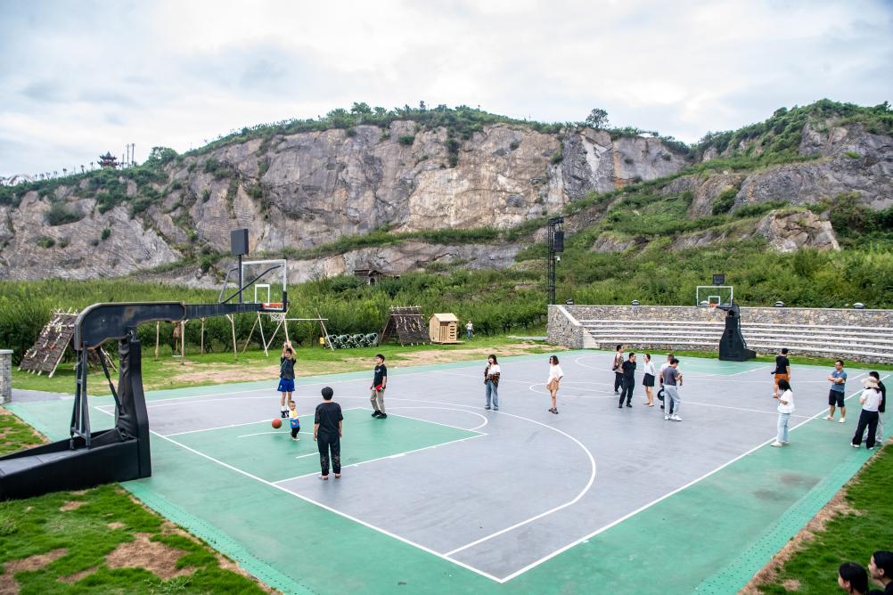 2025年8月16日,在重庆市北碚区静观镇中华村,游客在矿坑修复改造的运动场内打球。新华社记者 唐奕 摄